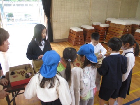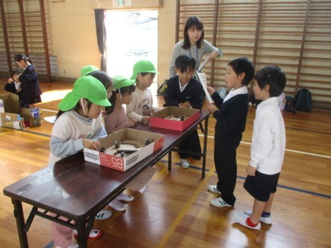 どんぐりやまつぼっくり、木の枝を使って作った「めいろ」や「クレーンゲーム」、「おかし屋さん」など、いろいろなお店で遊んでもらいました。