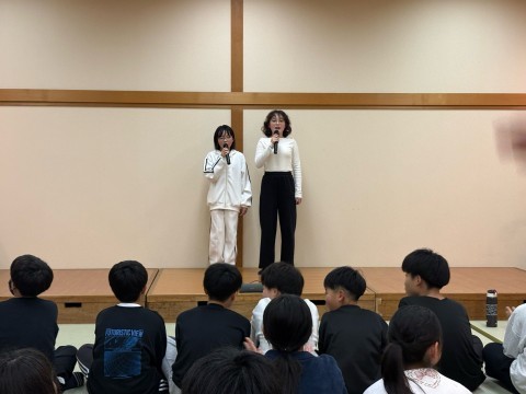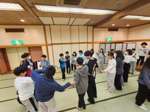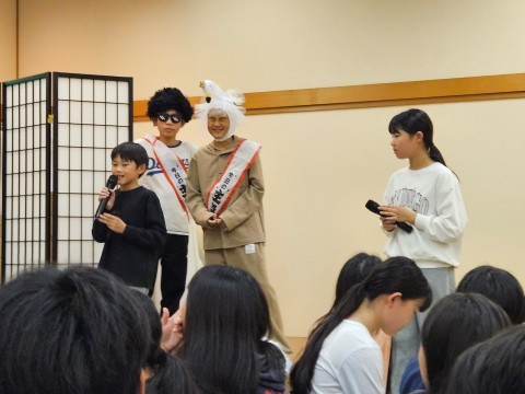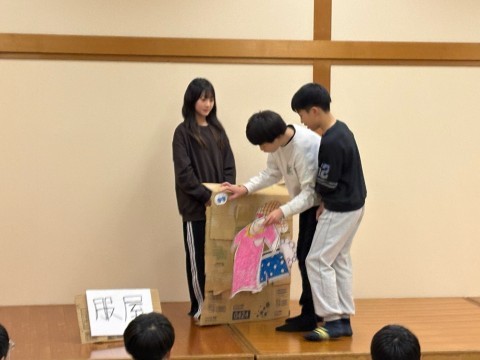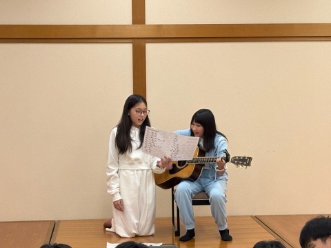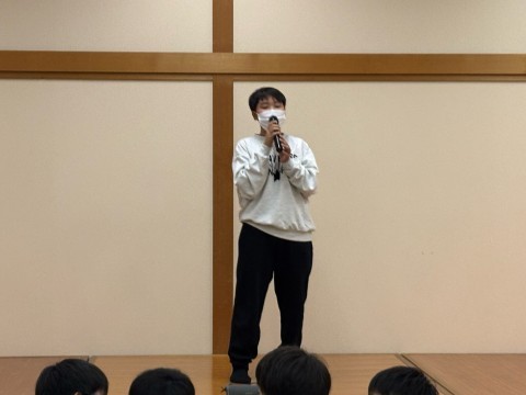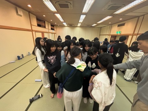夜レクのようすです。人間知恵の輪や新聞紙ゲーム、特技披露をして、楽しみました。