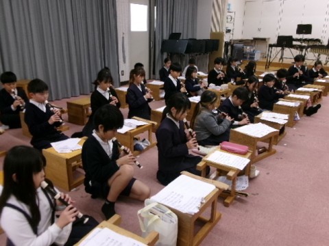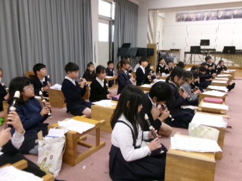 リコーダーで低い「ド」「レ」「ミ」の音を出す練習をしました。