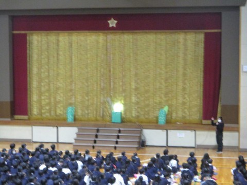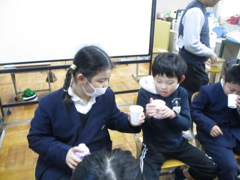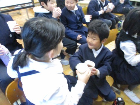 今日の朝礼の時間にひまわり発表会がありました。練習の成果を発揮し、素晴らしい舞台となりました!朝の会では、紙コップにお茶をいれて、みんなで乾杯しました。その後、収穫したサツマイモをどうするか、話し合いました。