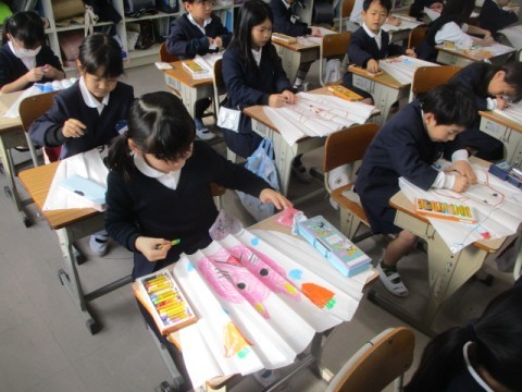 3学期は冬の遊びの一つ,凧あげを体験します。今日は凧作りをして,面にそれぞれ好きな絵を描きました。