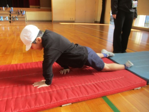 今日の朝の会は体育をしました。マット運動で動物の動きのまねっこや前転の練習を頑張りました。