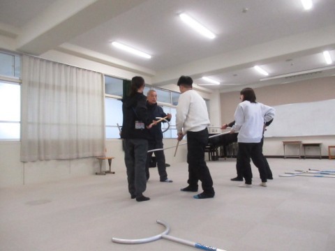 「不審者対応避難訓練」に向けて職員研修を行いました。講師の先生から、校内で不審者を見かけたときの対応やさすまたの使い方を教えていただきました。