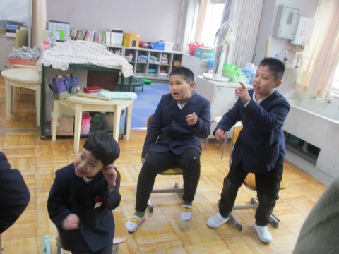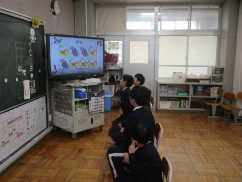 今日の朝の会は音楽でリズムゲームや楽器の練習をしました。リズムゲームはテレビの絵を見て、楽しく手拍子をし、取り組んでいました。