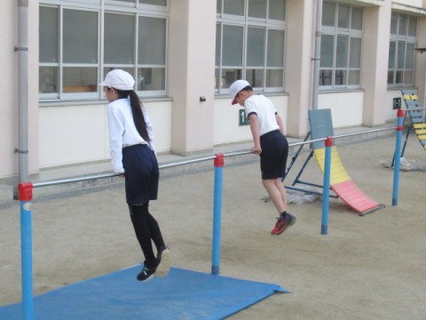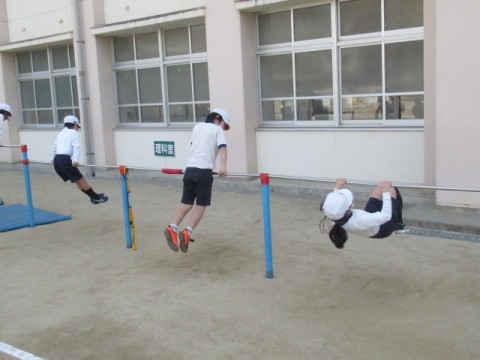 鉄棒をしました。かかえこみ前回り、ひざかけふり上がり等の技の練習をしました。