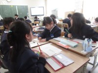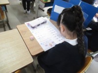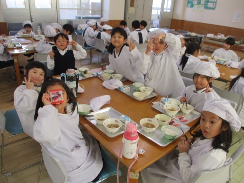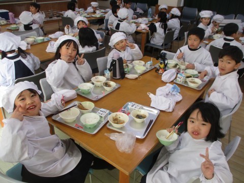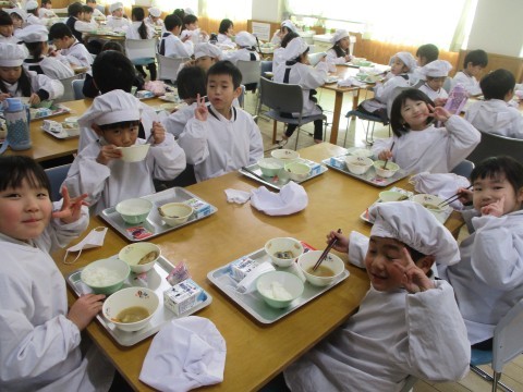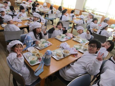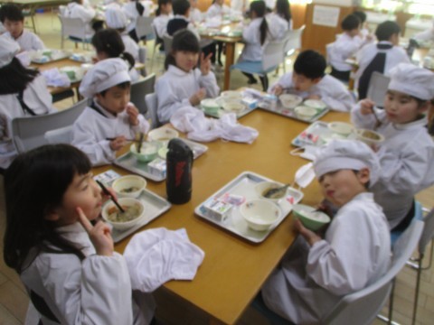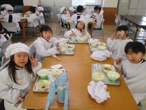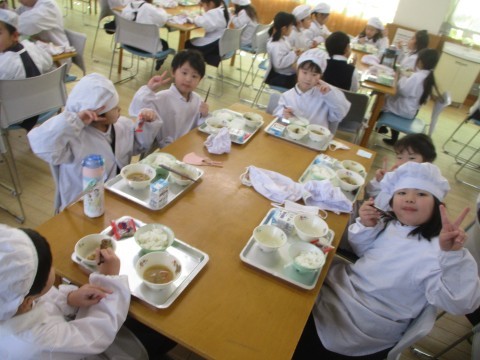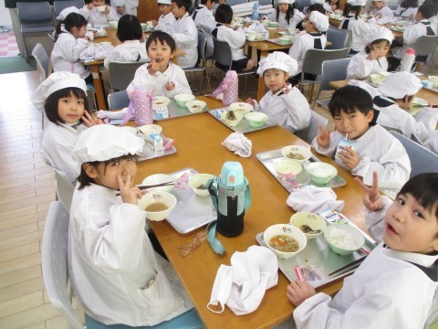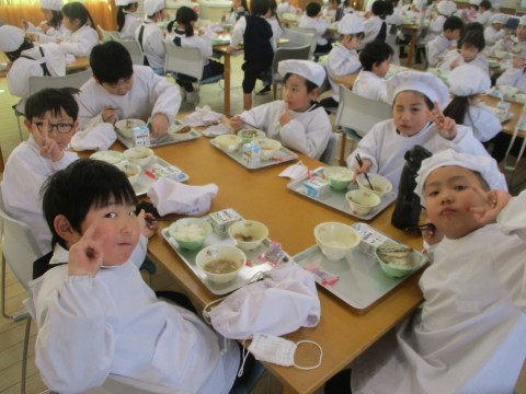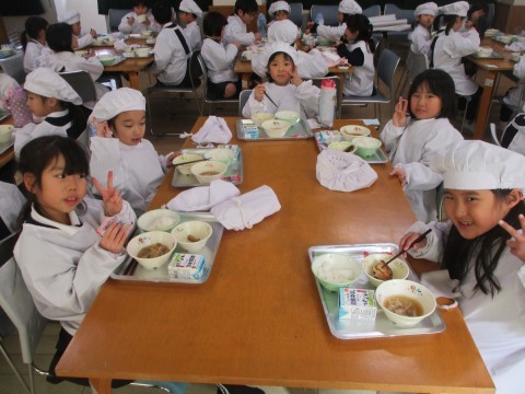 ランチルームで交流給食をしました。1-1と1-2のみんなでなかよく食べました。