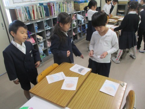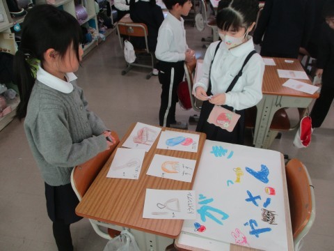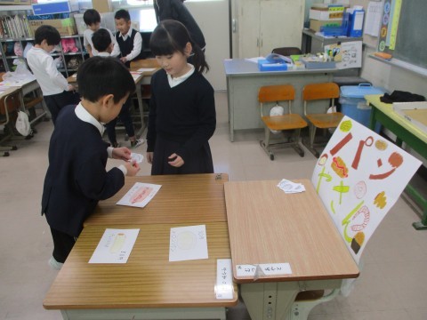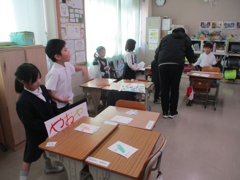 「ものの名まえ」の学習で、お店屋さんごっこをして楽しみました。まとめたものの名前と、一つ一つのものの名前のちがいが分かりました。