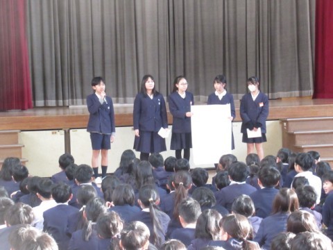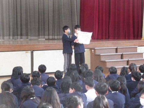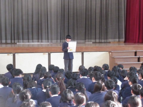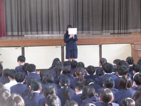 月曜朝礼がありました。校長先生の話。保健委員会、給食委員会、図書委員会、掲示委員会からのお知らせがありました。