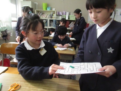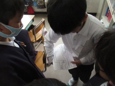 迷路作りをしました。完成したら、友だちと交換しチャレンジしています。
