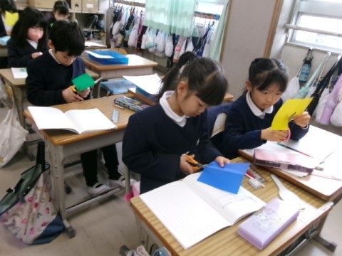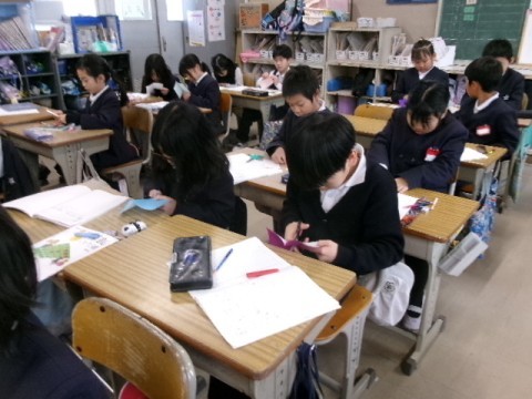 折り紙を折ったり,切ったりして分数の大きさを学習しました。
