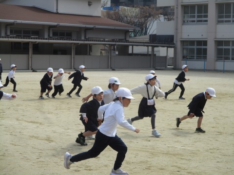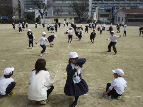 つぎは,「だるまさんがころんだ」をしました。みんなで一列に並んで,おにの人のところまで慎重に近づいていました。
