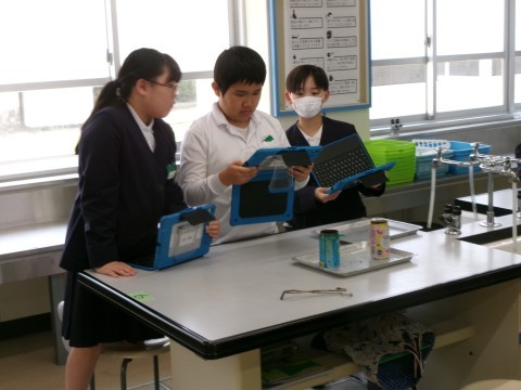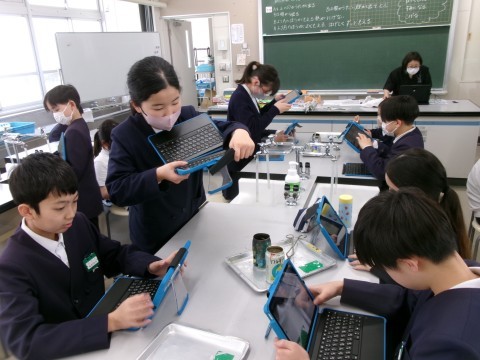 理科では,割りばしや新聞紙を燃やす実験を通して,ものの燃えるしくみについて学びました。タブレットを使って実験結果をまとめています。
