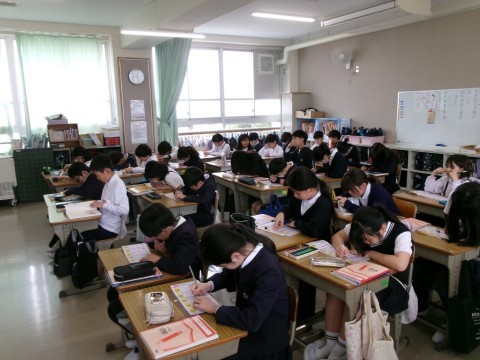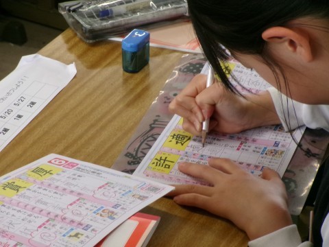 国語の授業の最初に新出漢字を丁寧に書いています。今日の漢字は,「容」「許」「授」「可」「術」「複」「適」です。高学年は,難しい漢字が増えてきます。