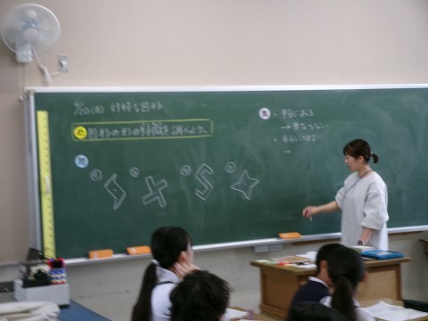 算数では,いろんな図形の特徴から,点対称の見方を育んでいました。