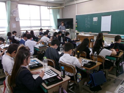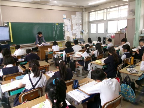1組は書写で筆の進め方の練習をしていました。2組は国語で「白いぼうし」の学習をしています。