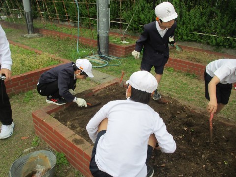 今日の朝の会は栽培で土づくりをしました。根っこを掘り起こし、土を柔らかくする作業をみんなで頑張りました。