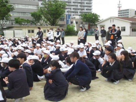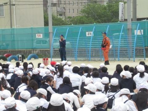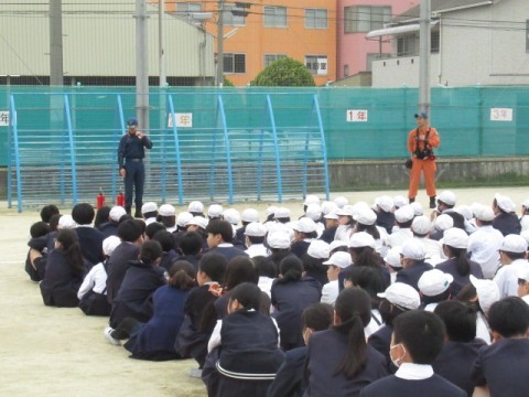 堺消防署の方にお越しいただき、避難訓練をしました。今回は、火災を想定した訓練です。静かに避難をし、しっかりと先生や消防士の話を聞くことができました。