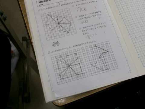 算数では,対称の中心を基準にして,点対称の作図をマスターしようと頑張っていました。
