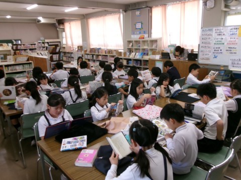 1組は「春風をたよって」の学習をしています。想像力を働かせて、続きの文章を考えていました。2組は図書館で本を読んでいました。集中して物語の世界に入り込んでいるようでした。