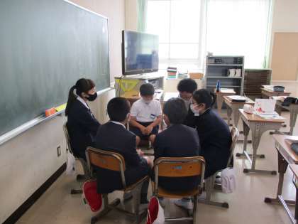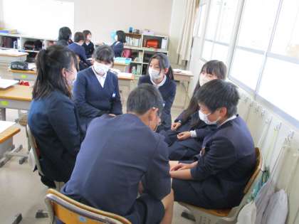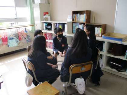 グループで一つの話を作りました。最初と最後の一文を決め、その間の内容を一文ごとに順番で考えていきました。