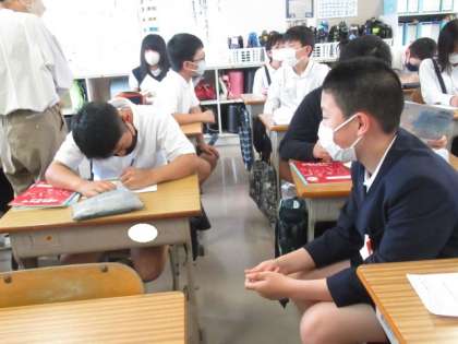 「あいさつに大切な心」について考えました。考えたことをプリントに書き、近くの子に話をしています。