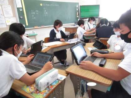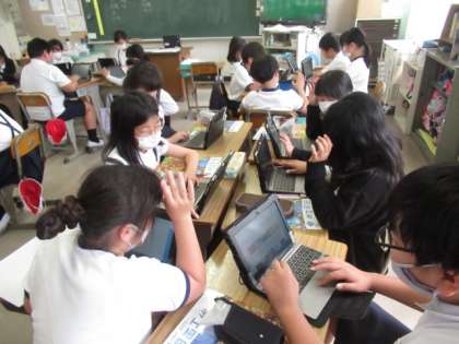 「大漁旗」のデザインを考えました。班になり、タブレットで調べました。