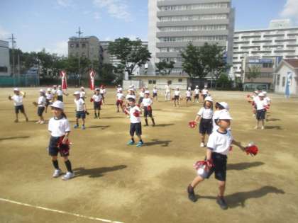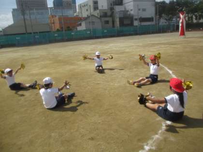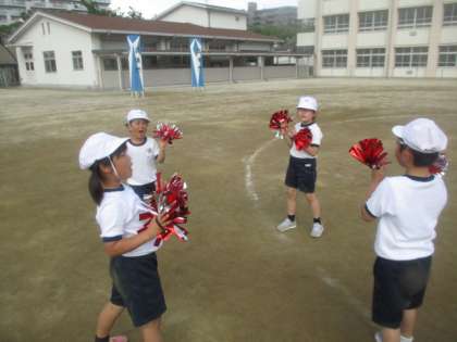 今日は、ポンポンを使って、運動場で踊りました。キラキラと光って、子どもたちの演技がとても華やかになりました。本番まで、練習はあと2日。1年生、成長した姿を見せられるよう、頑張ってます!