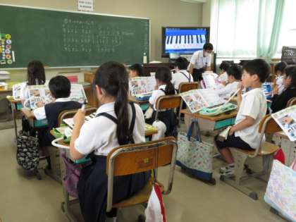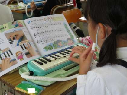 「鍵盤ハーモニカ」の学習です。「すいかのめいさんち」を練習しました。