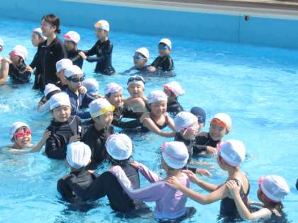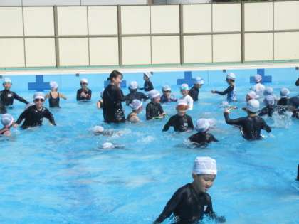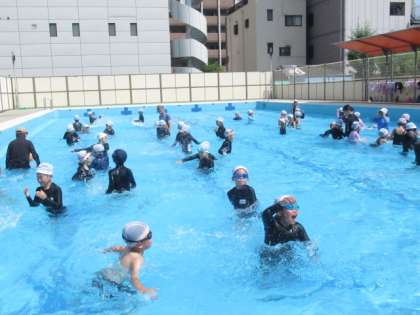 初めての水泳がありました。「入水の注意」「水慣れ」「水中ダンス」「宝さがし」などをしました。楽しんで取り組んでいました。