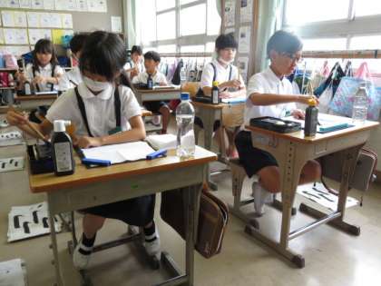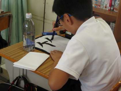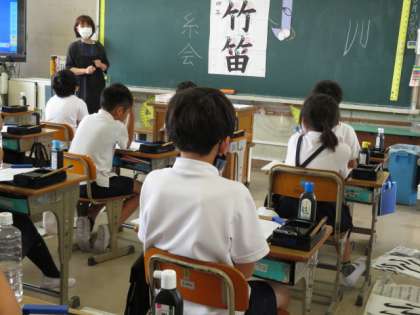 毛筆で「竹笛」と書きました。「竹」「笛」それぞれの漢字の「竹」の形のちがいに注意して、練習しました。