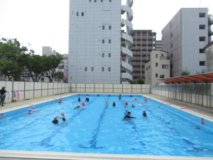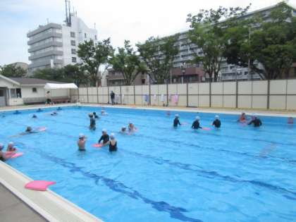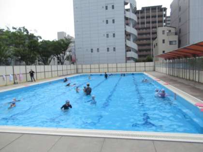 「水慣れ、バタ足」など練習をした後、ペアになりクロールの練習をしました。
