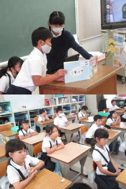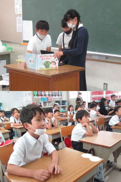 6年生の給食委員会が1年生のクラスへ行き、食育で「読み聞かせ」をしました。みんな真剣に聞いていました。