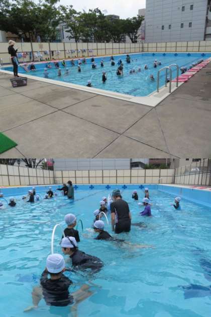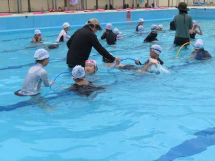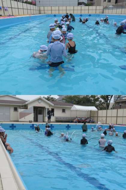 「水遊び」の学習です。フラフープを使って、水にもぐる練習をしました。