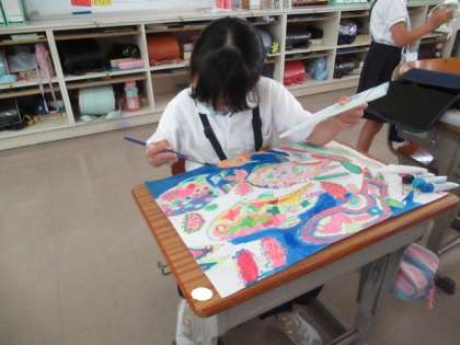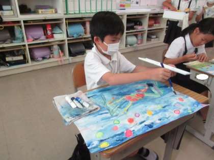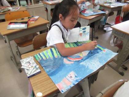「海の生き物たち」の制作を進めています。絵の具を使って、丁寧に色ぬりをしました。