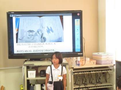 お気に入りの本を紹介しました。タブレットで作成したものをテレビにうつし、発表をしました。