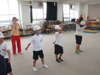 多目的室で「ひまわり体育」をしました。1学期最後の体育でした。準備運動をして、体幹トレーニング、大なわをしました。