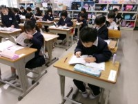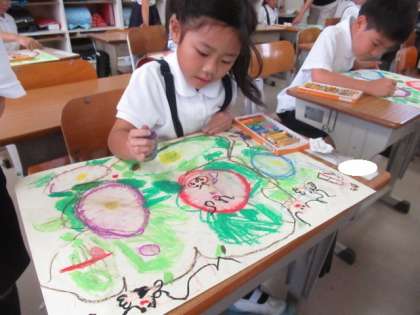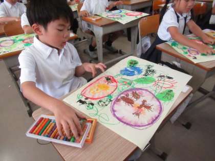 「あさがお」の絵を制作しています。クレパスを上手に使って、丁寧に描いています。