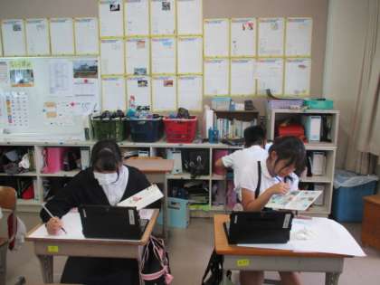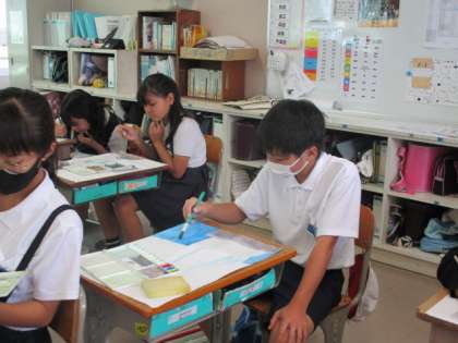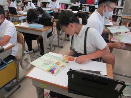 灯台の絵を描いています。三原色で色を作りながら、塗っています。