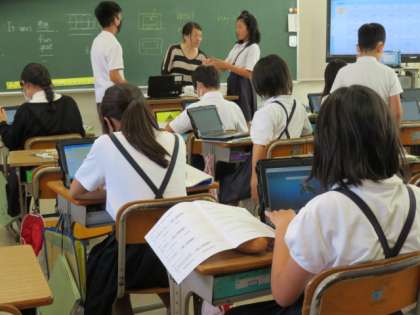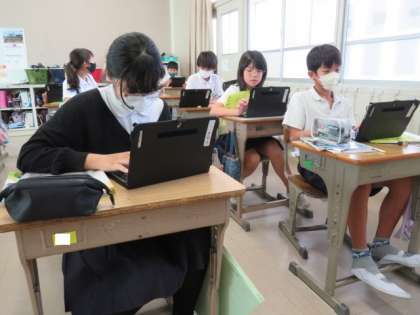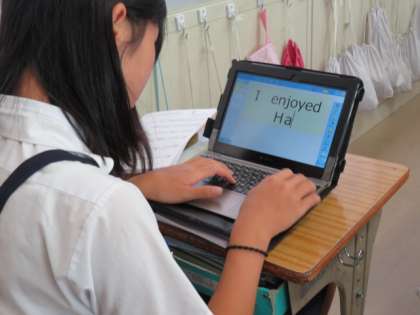 修学旅行の思い出を英語で表します。パソコンを使って準備をしました。