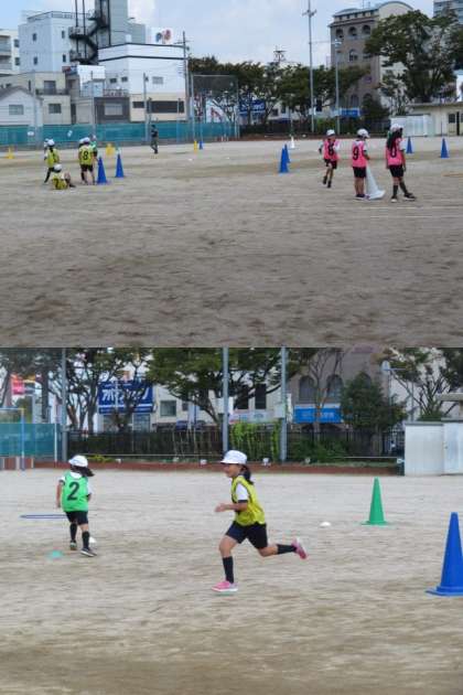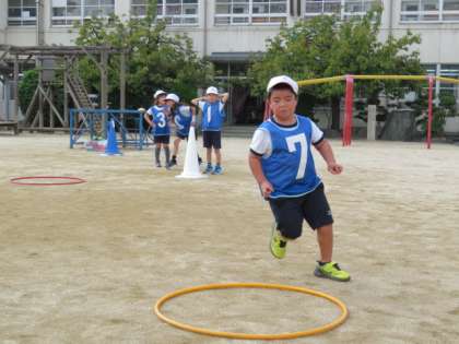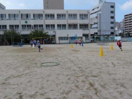 走の運動遊び「オリジナルコースをかけぬけろ!」の学習です。お友達のグループが作ったコースを走りました。