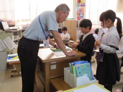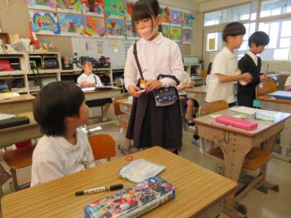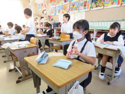 九九の学習を進めています。九九カードを使って「5の段」の確認をしました。