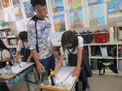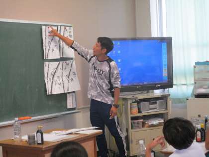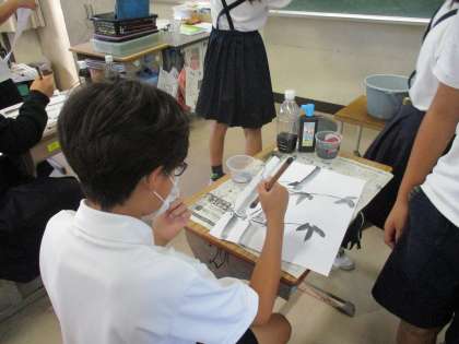 水墨画に挑戦しました。テーマは「竹」で、幹、筋、枝、葉の順番に描いていきました。