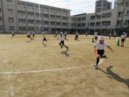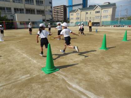 走の運動遊び「オリジナルコースをかけぬけろ!」の学習です。リングバトンを使ったリレーに挑戦しています。