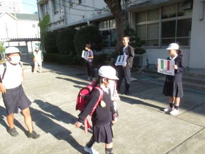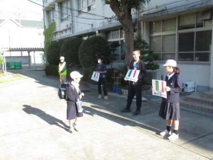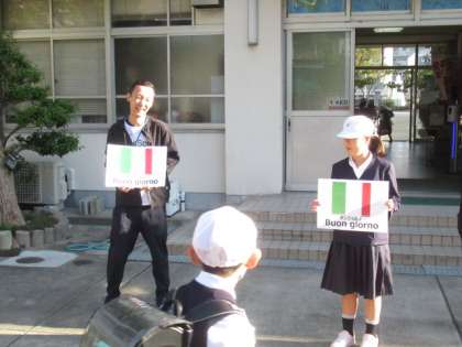 G7あいさつ運動 10/24(火) 公開日 2023/10/24 更新日 2023/10/24 児童会 今週末に開催される「G7大阪・堺貿易大臣会合」に合わせて、本校でも「G7あいさつ運動」に取り組んでいます。今日は「イタリア語」であいさつをしました。 「ボンジョルノ〜♪」