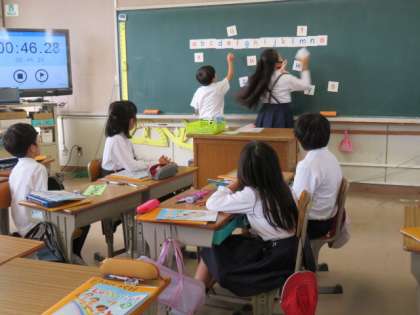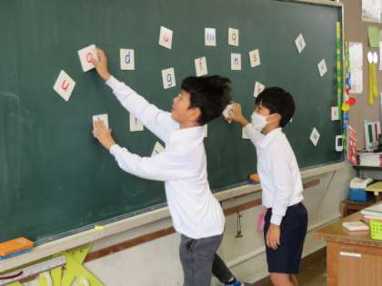 アルファベットの学習しました。ばらばらのアルファベットカードを制限時間内に、順番に並べました。