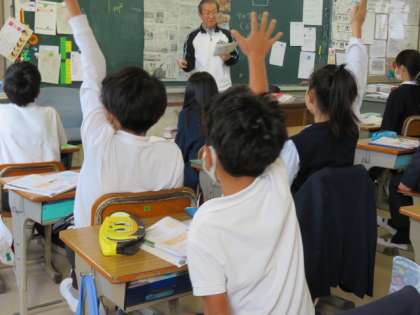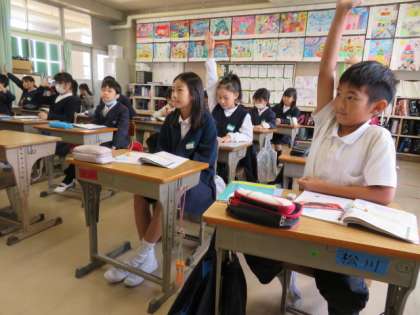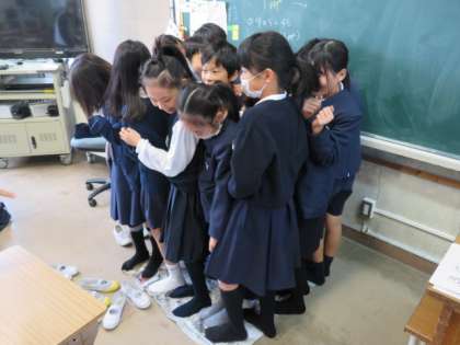 「面積」の学習で「1平方メートル」について学習しました。「1平方メートル」の新聞紙に、児童が17人、入ることができました。