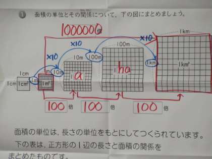 面積の単位とその仕組みについて学習をしました。図と表を見ながら考えました。