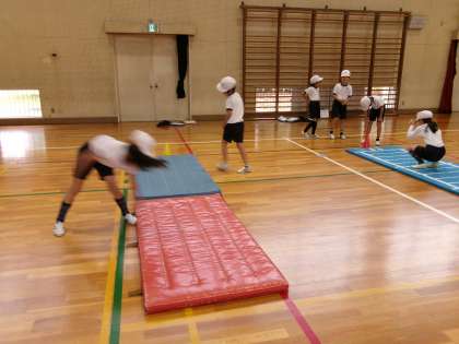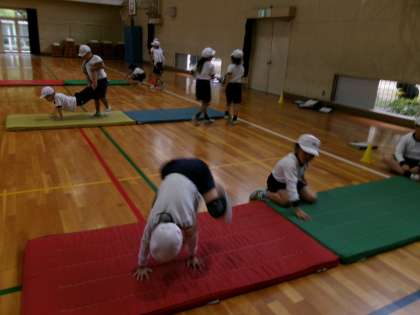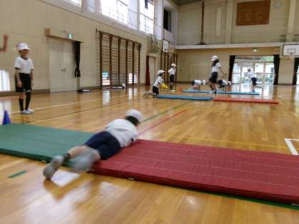 動物になりきったり、忍者のような動きをしたり、いろいろな転がり方をしてマット運動を楽しんでいます。