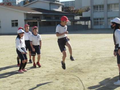 体育で「大なわ」をしました。制限時間内で何回とべるか挑戦をしました。