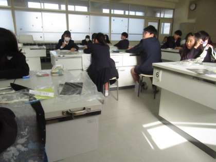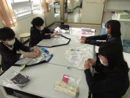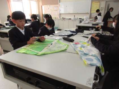 エプロンをつくっています。ひもを調整したり、ひもを協力して結んだりする姿が見られました。